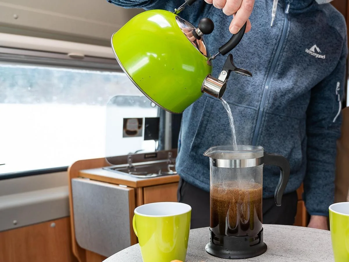 Eine kurze praktische Prüfung zeigt sofort, ob Gasversorgung und Flamme stimmen. Nutzen Sie den Frühjahrsputz im Camper einfach dazu. den ersten Kaffee der Saison zu kochen – und testen gleichzeitig die Gasanlage. Achten Sie dabei auf: