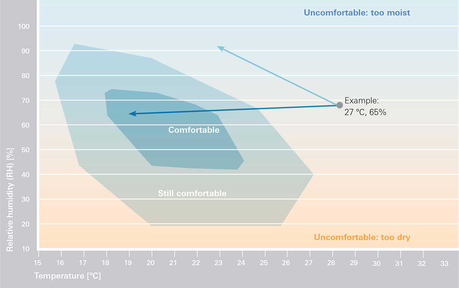 La bonne interaction entre la température et l’humidité de l’air a un impact direct sur votre bien-être. Plus la température ambiante augmente, plus l’humidité de l’air doit diminuer. Une pièce est considérée comme confortable si sa température est comprise entre 18 et 24 degrés avec une humidité relative de l’air comprise entre 40 et 70 pour cent.