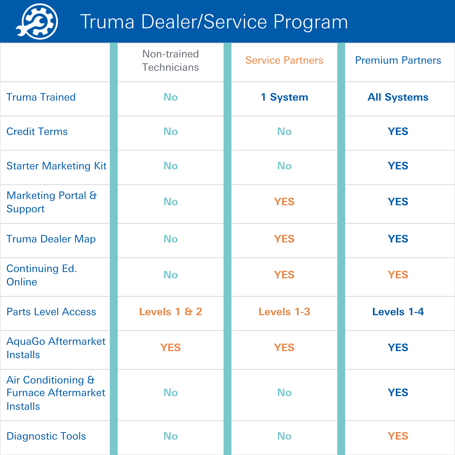 - A Dealer/Service location with 25% of its technicians trained on all of Truma’s systems is eligible to be a Premium Partner. Premium Partners may service all Truma systems and sell select products, such as the Truma AquaGo and Aventa, as Aftermarket installations to end-users.